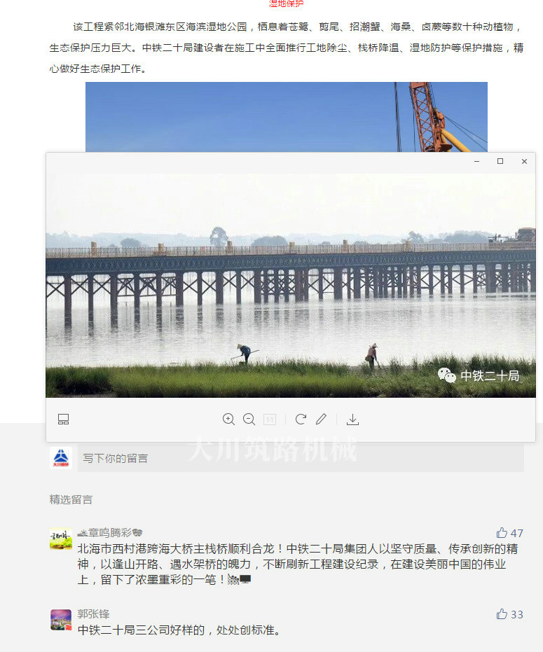 該工程緊鄰北海銀灘東區(qū)海濱濕地公園,棲息著蒼鷺、剪尾、招潮蟹、海桑、鹵蕨等數(shù)十種動植物,生態(tài)保護(hù)壓力巨大。中鐵二十局建設(shè)者在施工中全面推行工地除塵、棧橋降溫、濕地防護(hù)等保護(hù)措施,精心做好生態(tài)保護(hù)工作。